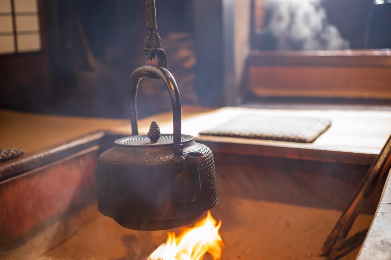 変わらない長寿館を象徴する場のひとつが、本館・玄関から入ってすぐのところにある囲炉裏部屋。朝7時から夜の7時過ぎまで囲炉裏に火が入り、宿泊者は誰でも立ち寄れる。お客さんのあいだでお茶を振る舞い、会話に花が咲くことも多いという。海外から来た宿泊客にもとても評判がいいそうだ。囲炉裏部屋にお客さんが来ると「お茶飲んで行かっさい」と、もてなしていた祖父の姿を、岡村さんはよく思い出すという。