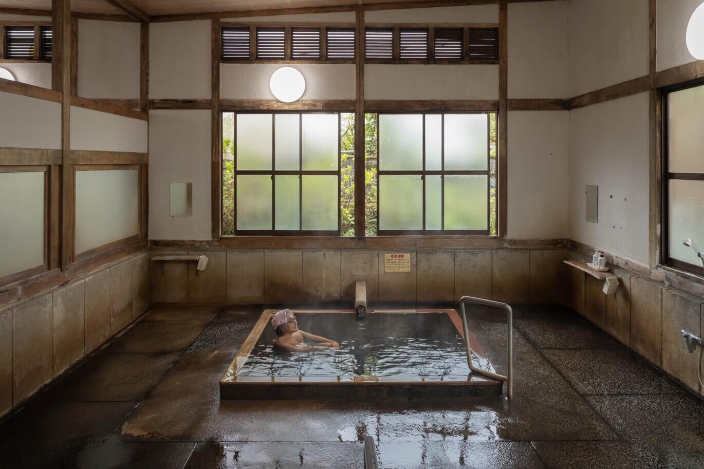 まず、堂々とした面構えがいい。創業は昭和9年。温泉街にあるのではなく、城跡そばの住宅街の中にポツンとある。地元の暮らしに寄り添うかたちで営みを続けてきたことは明らかだ。懐かしい匂いのする脱衣所で服を脱ぎ、ガラスの引き戸を開ける。真四角の湯船がひとつだけ。カランの数を最小限に留めているその潔さが美しい。大きな窓から降り注ぐ光が立ちのぼる湯気を際立たせる。加水・加熱は一切無しの